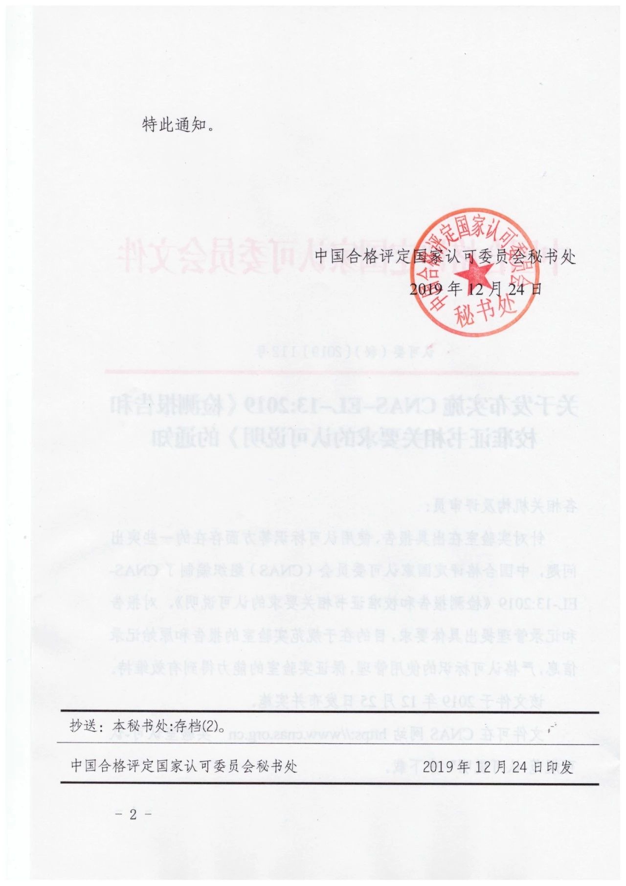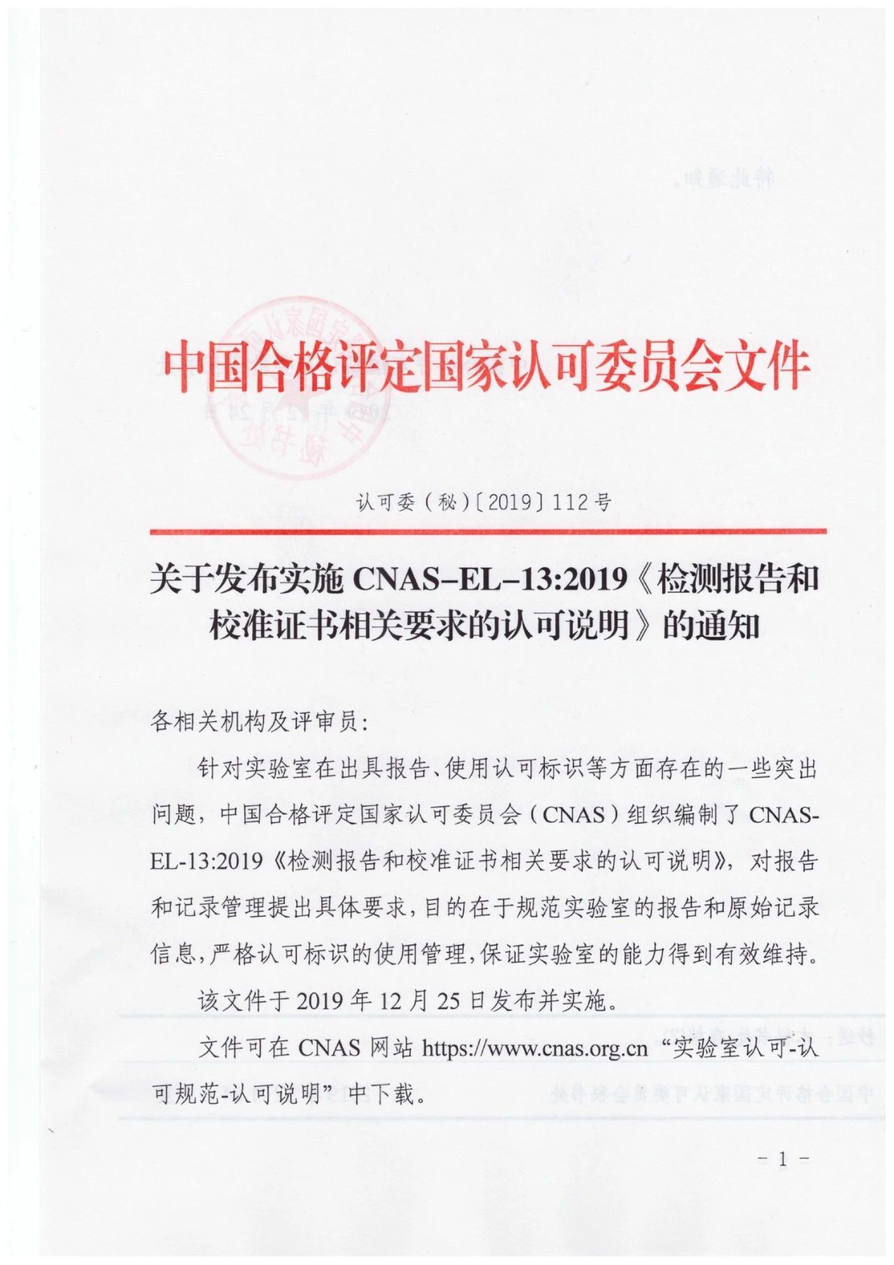 關(guān)于發(fā)布實(shí)施CNAS-EL-13:2019《檢測(cè)報(bào)告和校準(zhǔn)證書相關(guān)要求的認(rèn)可說明》的通知