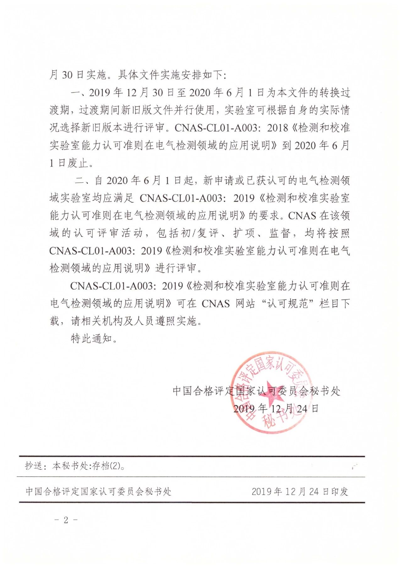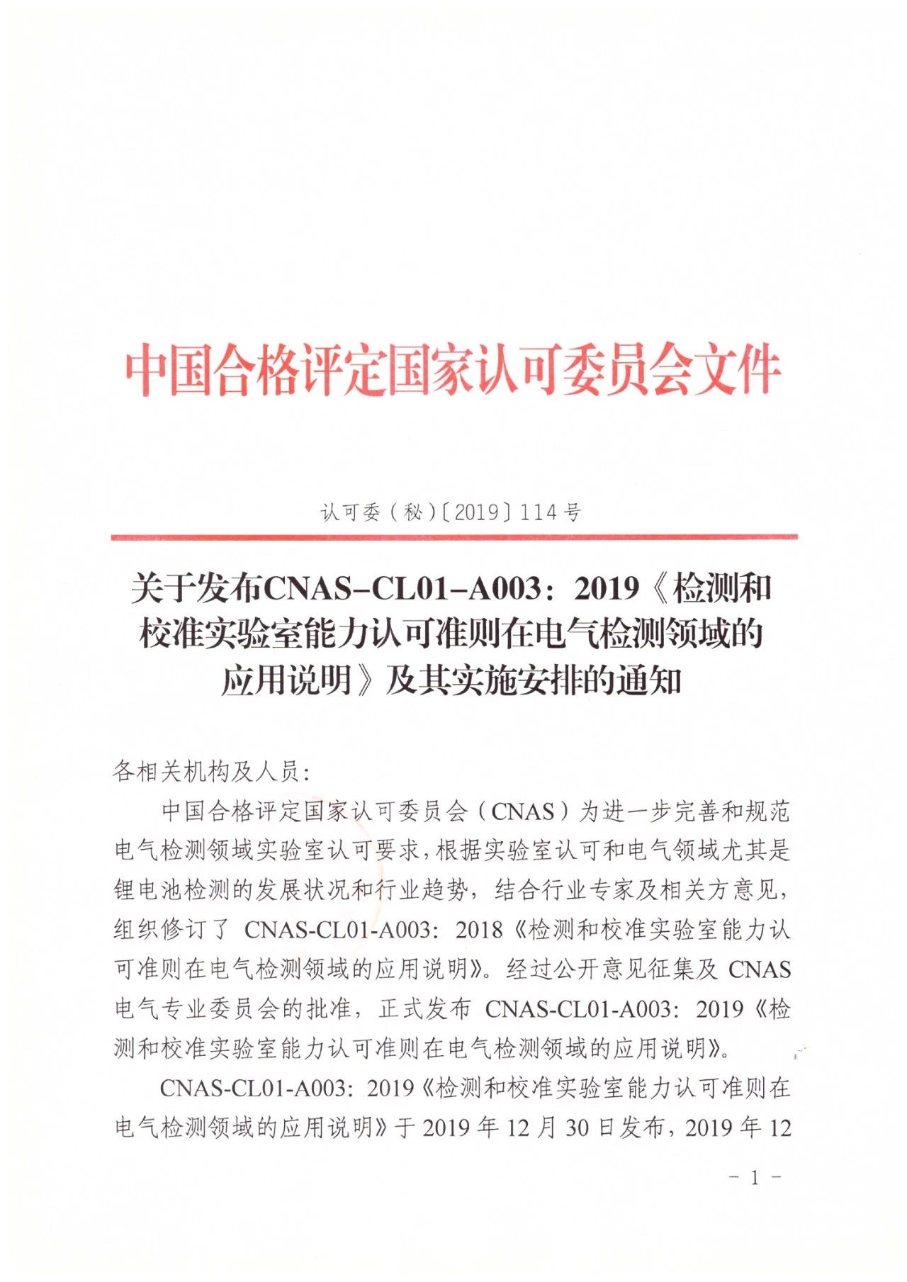 關(guān)于發(fā)布CNAS-CL01-A003:2019《檢測(cè)和校準(zhǔn)實(shí)驗(yàn)室能力認(rèn)可準(zhǔn)則在電氣檢測(cè)領(lǐng)域的應(yīng)用說明》及其實(shí)施安排的通知