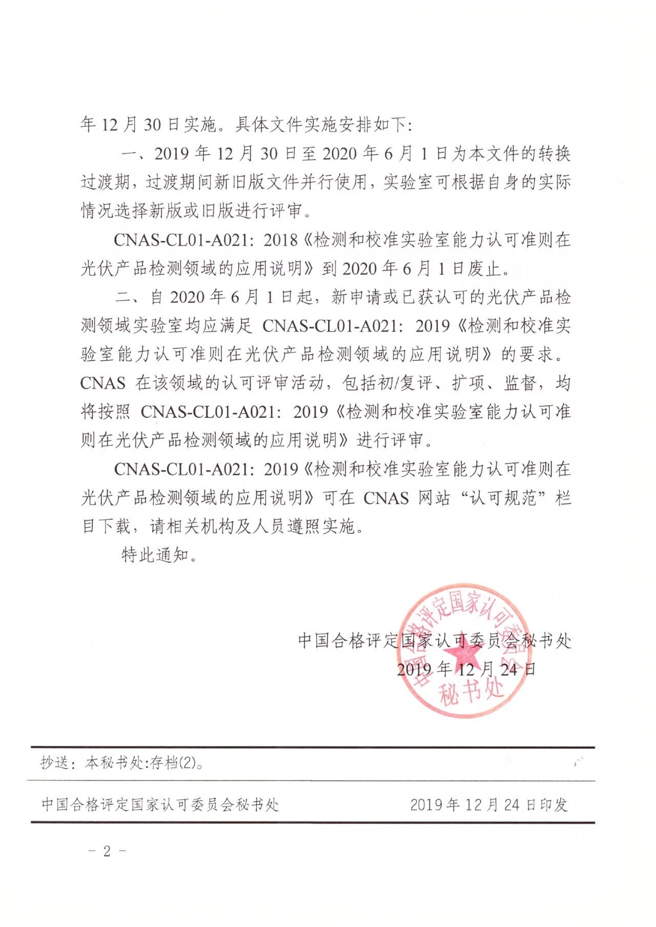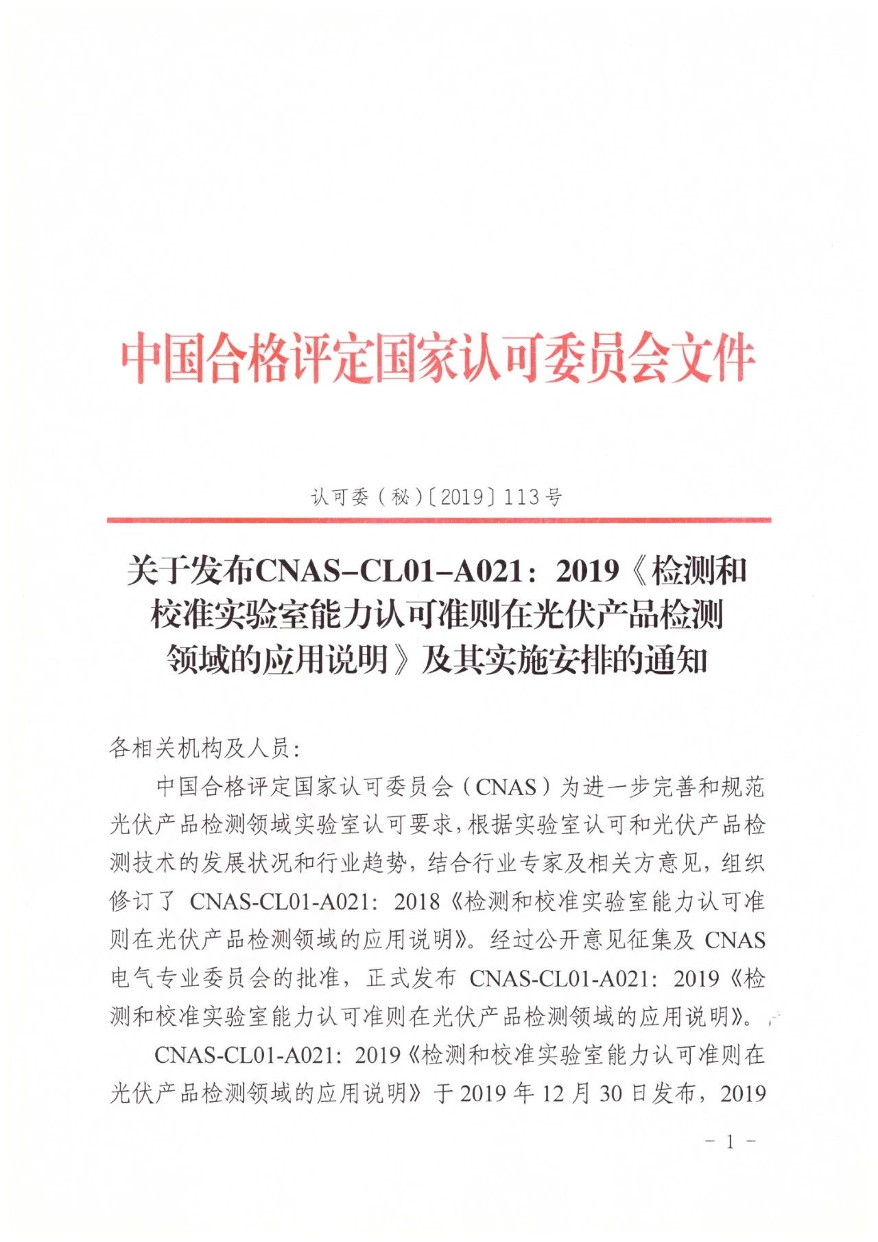 關(guān)于發(fā)布CNAS-CL01-A021:2019《檢測(cè)和校準(zhǔn)實(shí)驗(yàn)室能力認(rèn)可準(zhǔn)則在光伏產(chǎn)品檢測(cè)領(lǐng)域的應(yīng)用說明》及其實(shí)施安排的通知